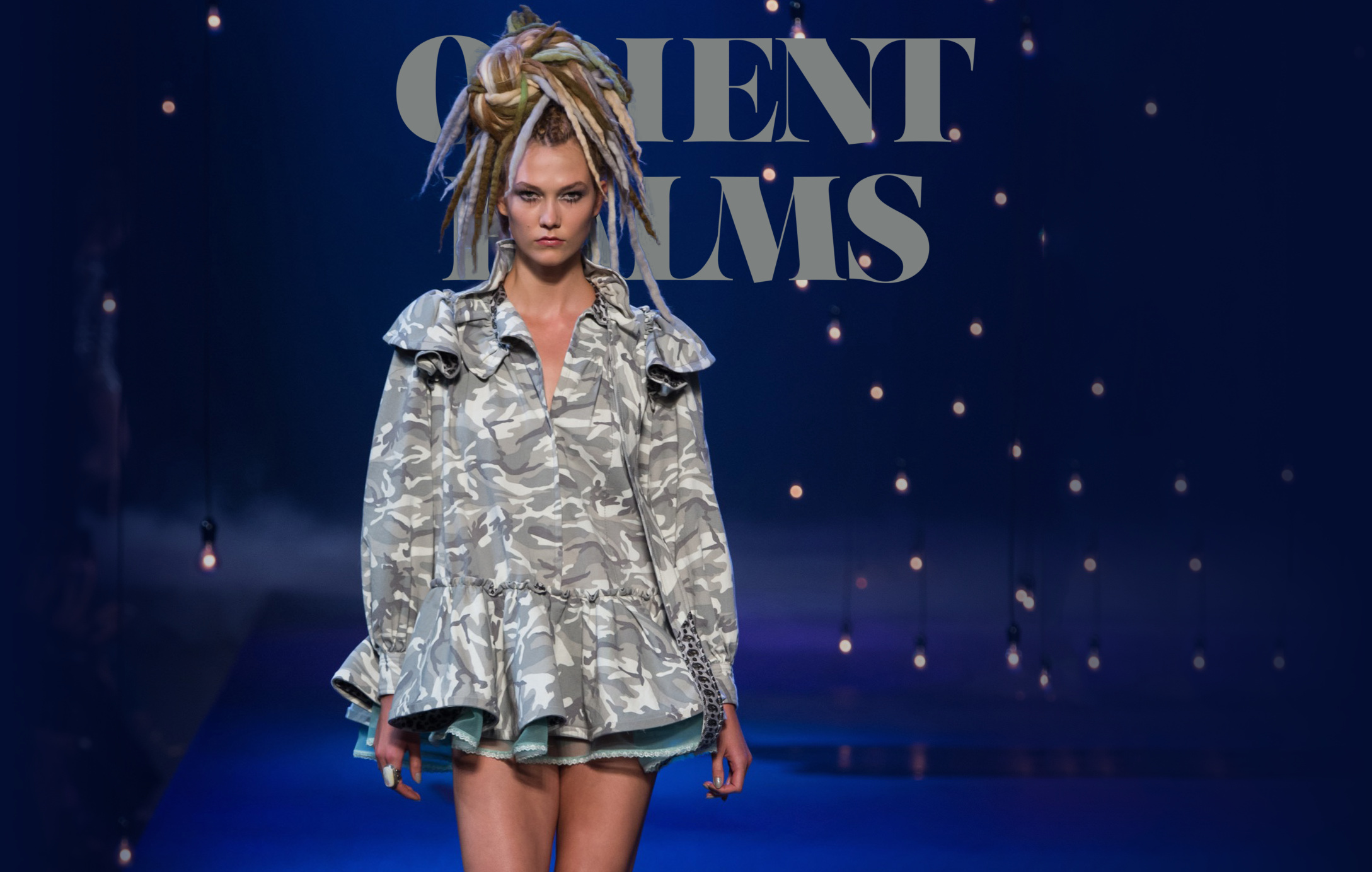 Marc Jacobs creates an elegant street-style look in the right attire. His chunky camouflage short dress is adorned with a beautiful miniature piece of light blue tulle from below. It reminds us of a Goth Victorian appearance, especially with its halo of elaborate dreadlocks. Also, we cannot but talk about the vertiginous wedge boots and their cosmic design, which definitely add a special edge to the look. A last special mention is to be made to the fine stone ring that the model wears!